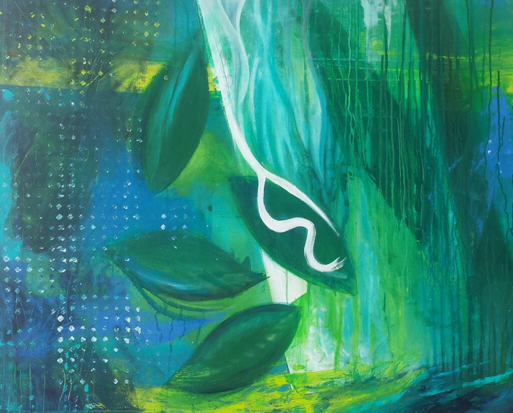 Eine Leinwand mit einem gelben Streifen war der Beginn. Daraus spann sich der Faden und ging unweigerlich auf in einen Tanz aus Grün, Bewegung und Form.